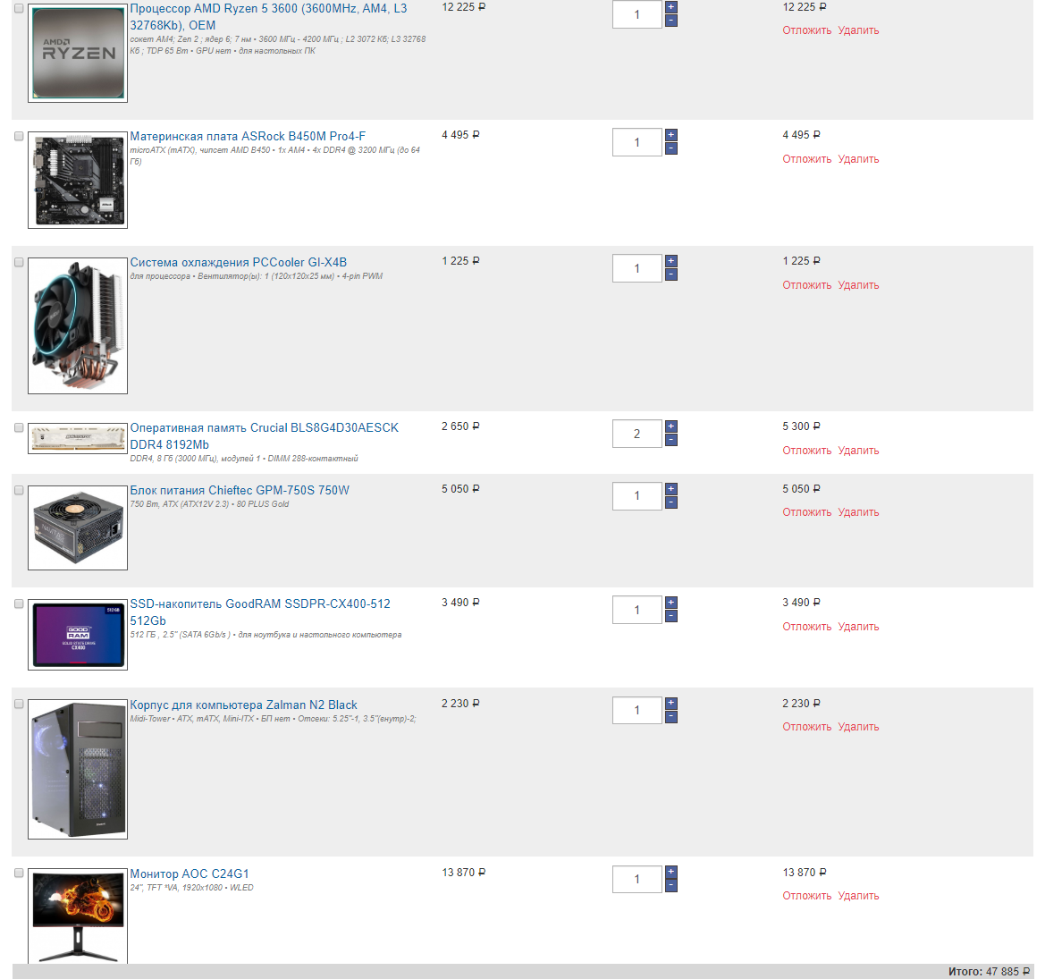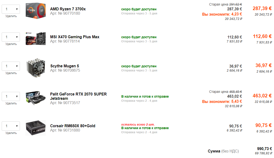 1. Процессор: AMD Ryzen 7 3700x (https://www.computeruniverse.net/ru/amd-ryzen-7-3700x-boxed-inkl-wraith-prism-kuehler) 2. Мат плата: ASUS PRIME X470-PRO (https://www.computeruniverse.net/ru/asus-prime-x470-pro) или ASUS TUF B450-PRO GAMING (https://www.computeruniverse.net/ru/asus-tuf-b450-pro-gaming) 3. Кулер ЦП: Scythe Mugen 5 "PCGH Edition" (https://www.computeruniverse.net/ru/scythe-mugen-5-pcgh-edition) 4. Оперативка: G.Skill Tident Z Neo 32GB (https://www.computeruniverse.net/ru/gskill-tident-z-neo-32gb-ddr4-32gtznc-ram-multicoloured-illumination) или G.Skill Ripjaws V 32GB (https://www.computeruniverse.net/ru/gskill-ripjaws-v-32gb-ddr4-k2-ram-3) 5. Видеокарта: ASRock Radeon RX Vega 56 PHANTOM (https://www.computeruniverse.net/ru/asrock-radeon-rx-vega-56-phantom-gaming-x-80-gb-enthusiast-videokarta) 6. SSD под систему: ADATA XPG SX8200 Pro M.2 NVME PCIe Gen3x4 1TB (https://www.computeruniverse.net/ru/adata-xpg-sx8200-pro-m2-nvme-pcie-gen3x4-1tb) 7. Второй SSD под базы 1С и игры: ADATA XPG SX8200 Pro SSD M.2 2280 2TB (https://www.computeruniverse.net/ru/adata-xpg-sx8200-pro-ssd-m2-2280-2tb) 8. Блок питания: Corsair TX850M 80+ Gold 850 Watt (https://www.computeruniverse.net/ru/corsair-tx850m-80-gold-850-watt) 9. Корпус: BeQuiet PURE BASE 500 BLACK Window (https://kazan.nix.ru/autocatalog/cases_be_quiet/Miditower-be-quiet-BGW34-Pure-Base-500-Black-ATX-bez-BP-s-oknom_438429.html?_openstat=bWFya2V0LnlhbmRleC5ydTvQmtC-0YDQv9GD0YEgYmUgcXVpZXQhIFB1cmUgQmFzZSA1MDA7V3V1SkNnVHY2N3dUaDlFMklCVVZCZzs&frommarket=https&ymclid=15746070275549934629500005) 10 Монитор: LG 32GK850G-B G-Sync Gaming Monitor (https://www.computeruniverse.net/ru/lg-32gk850g-b-g-sync-gaming-monitor)