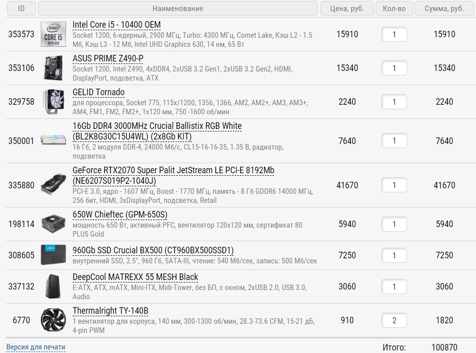 Доброго времени суток всем! Прошу помощи у более опытных сборщиков ПК. Долго просидел на форуме, пересмотрел конфиги, в итоге собрал солянку, но не знаю будет ли все это нормально работать) 1) 70-71 к рублей 2) Город: Пенза. Магазины: https://technopoint.ru/ и https://www.onlinetrade.ru/ 3) Системный блок. 4) Берется для современных игр и простого монтажа видео. Монитор 23.5" Samsung S24F354FHI 1920x1080, AMD FreeSync 5) Разгон не планируется. 6) Апдейт не планируется в ближайшее время. 7) Кроме периферии ничего нет. 8) Предпочтений нет. 9) Все что смог получить: