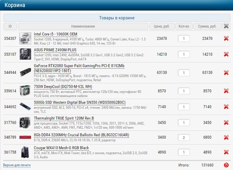 messiah14 можно рассмотреть вот такой вариант. Я бы собирал примерно так. Z-чипсет всё равно бы оставил, так или иначе. Разницу суммы в чипсете, если брать даже B460 или H470 даже на видеокарту RTX 2080 Ti не хватит, да она и не принципиальна собственно.