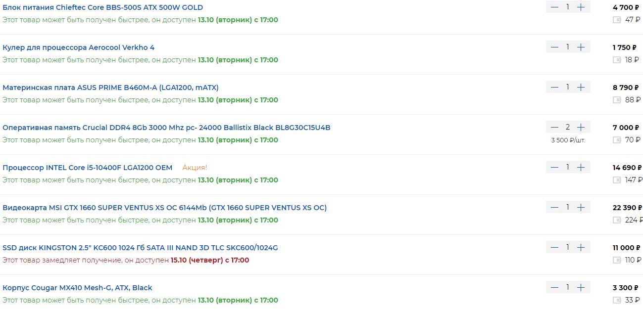 h0usemouse если магазин принципиален ДНС, то так можно, если мы собираем по принципу "поставил и забыл": Core i5 10400f + be.quiet Pure Rock 2 или Core i5-10600 MSI MAG B460 Bazooka Crucial Ballistix BL8G26C16U4B x2 - 16Gb SSD Adata XPG Gammix S11 Pro 1Tb Deepcool DQ650-M-V2L PowerCase Mistral Mesh X4 MSI RTX 2070 Super Gaming Trio Итого: 103 000 р. или 106 000 р. Почему делаю акцент на магазине. По большому счёту, в эту сборку можно спокойной уместить RTX 2080 Super, но в ДНС её нет, лежит только обычная версия RTX 2080. Переплаты она не стоит. Зато на сэкономленные деньги можно поместить в сборку комплектующие чуть по лучше в виде той же материнки и бОльшего SSD.