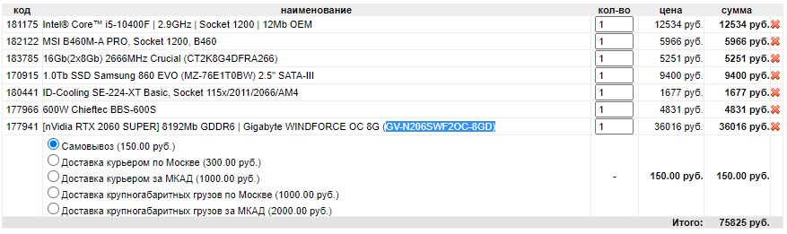 Блок питания не полупассив, т.е. без нагрузки вентилятор вращается с низкой скоростью, довольно тихо, как по мне. Если охота полупассив, то нужно доплачивать, а это переплата и приличная (~5000 р.), плюс бренд и прочее. С AMD заморачиваться не советую, потому что сих процессоры стоят ОТ 34000 р., и то, у вас их пока нет. А брать сейчас предыдущий Ryzen экономически и практически не целесообразно. В играх Core i5 10400f + хорошая видеокарта покажет результаты как минимум не хуже. Что же касается самой видеокарты, то RTX 2060 Super в ДНС/Онлантрейд/Ситилинк в наличии нет. По Мск ценам взял запас в 37 000 р. на видеокарту. Много денег отъедают накопители. Пришлось брать SATA на 1Tb. Его разбить на 2 раздела: под Windows, остальное под игры. По монитору не подскажу, выбрал по рейтингу (возможно, что есть и дешевле) лучше спросить тут >>> Выбор Full HD ЖК-монитора По итогу ценника выходит: 117 171 р. Если дорого, то нужно чем-то жертвовать.