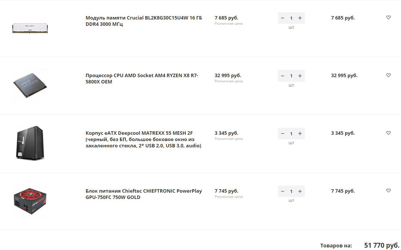 Процессор AMD Ryzen 5 5600X, BOX 1 шт.24990 руб. Материнская плата GIGABYTE B550 GAMING X 1 шт.9830 руб. Модуль памяти CRUCIAL Ballistix BL16G26C16U4B DDR4 — 16ГБ 2 шт. x 7090 руб.14180 руб. Корпус ATX ZALMAN N5 MF, черный 1 шт.3580 руб. Блок питания CORSAIR RM750, 750Вт, черный 1 шт.11300 руб. Система охлаждения жидкостная Deepcool GAMMAXX L360 RGB V2