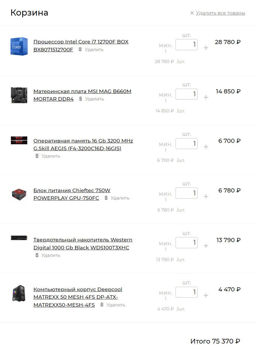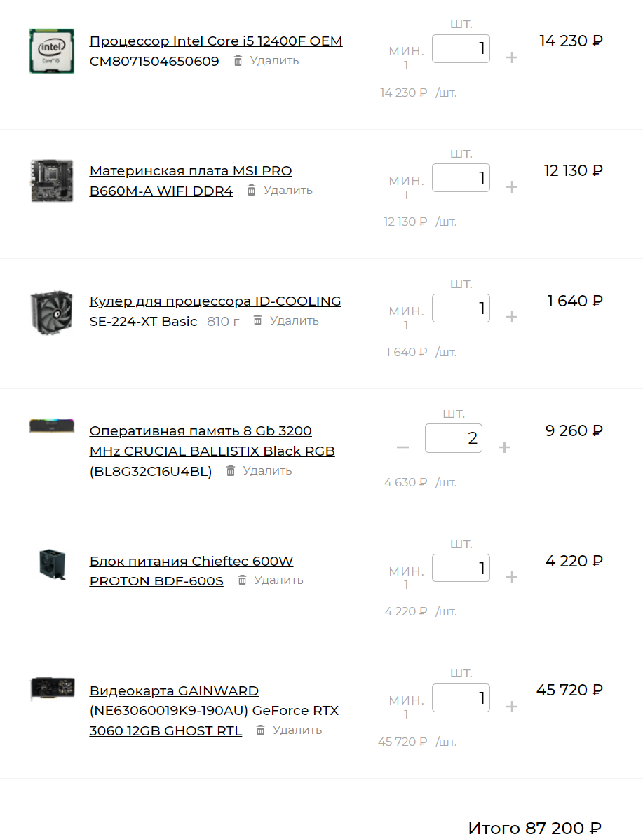 Добрый день. Прошу помочь с подбором/комментариями по конфигурации. 1) 80-100к, не обязательно во всю сумму, главное, чтобы требования тянул, получится дешевле, значит хорошо. 2) Москва, любые магазины 3) Только системный блок 4) MMO, CS:GO 300-400 fps 5) Категорически не планирую никаких разгонов 6) Не планирую 7) Нет 8) Только Intel, желательно размером поменьше, без водяного охлаждения, обязательно свободный слот под PCI для отдельной сетевой карты, без RGB, либо закрытый, либо не светящийся вообще, чем тише, тем лучше. 9)