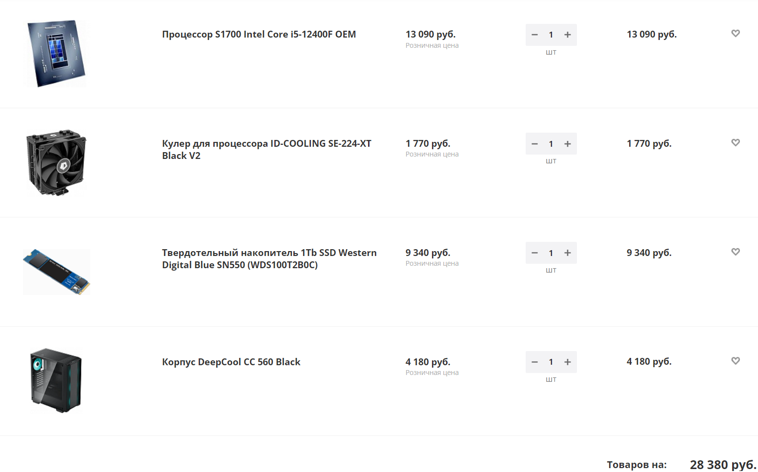 fistahka71 Процессор Intel Core i5-12400 OEM - 12685р Материнская плата Asus Tuf Gaming B660M-Plus D4 - 10640р Оперативная память 2х8Gb 3200MHz Patriot Viper 4 (PV416G320C6K) - 6545р Кулер для процессора ID-Cooling SE-224-XT White - 1330р Корпус Deepcool Matrexx 40 - 2680р Блок питания Corsair RM550x - 4785р SSD WD Blue SN570 1Tb - 9775р Итого: 48400р. При желании можно взять блок питания не модульный и по компонентам проще, Chieftec Core BBS-600S. SSD меньшего объемом, 512Gb Adata XPG Gammix S11 Pro или чисто под винду 256Gb Adata XPG SX8200 Pro. На счет кулера ID-Cooling SE-224-XT White уточните, идут ли у них крепления под Socket 1700. Для корпуса нужно докупить три 140мм вентилятора, два на вдув и один на верхнюю крышку. Лучше бы взял Deepcool CC560 в Онлайнтрейд. rennug Какой город у тебя?