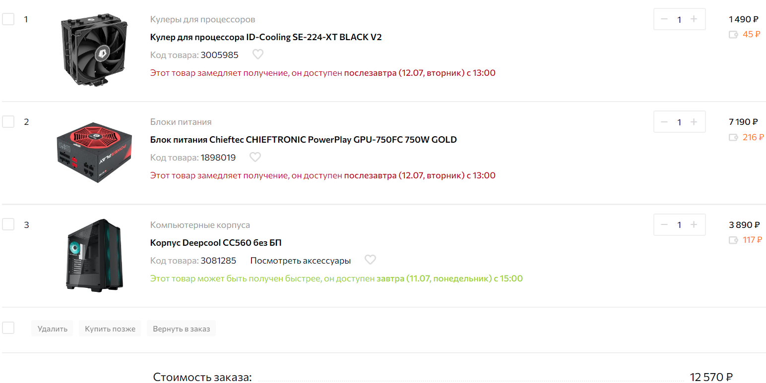 RoflWafles Процессор Core i7-12700KF OEM - 30170р R-Seven Материнская плата Asus PRIME Z690-P WIFI D4 - 22999р ДНС Оперативная память 2х16Gb G.Skill RIPJAWS V [F4-3600C16D-32GVKC] - 12150р R-Seven Охлаждение процессора LIAN LI Galahad AIO 360 - 13699р ДНС SSD Samsung 970 Evo Plus 1Tb - 11450р R-Seven Корпус Deepcool CG560 - 5390р Онлайнтрейд Итого:96218р. Магазин R-Seven высылает в регионы, там дешевле аналогичные позиции, чем в магазинах твоего города. viksoto Процессор Ryzen 7 5800X - 20400р R-Seven Материнская плата Asus TUF B450M-PRO GAMING - 6199р ДНС Оперативная память 2х16Gb 3600MHz Patriot Viper Steel (PVS432G360C8K) - 8510р SSD Samsung 970 EVO Plus 1Tb - 11450р R-Seven Кулер Deepсool AK620 - 3950р Регард Блок питания Deepcool PQ750M - 6340р R-Seven Корпус DeepCool CC 560 - 4000р Регард Итого: 60849р. Все в наличии и не надо ждать с Aliexpress. Материнскую плату только нужно будет занести в сервис какой нибудь и прошить свежий BIOS(для этого нужен процессор старых серий), чтобы проц заработал. Если с Aliexpress, то SSD можешь взять Samsung PM9A1(аналог 980 Pro) или Samsung PM981A(аналог 970 Evo Plus), связку MSI MAG B550M Mortar/Asus TUF Gaming B550M-Plus+Ryzen 7 5800X и память Crucial Ballistix.