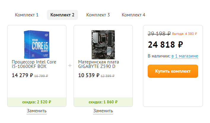 Те, кто сейчас собирает систему, в ДНСе опять появились выгодные комплекты, но к сожалению, самые интересные процы: i3-10100F, i5-10400F и i5-11400 в них не участвуют. https://www.pepper.ru/deals/intel-core- ... -15-199037