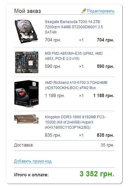 bokcep83 для грамотной помощи необходимо знать марку блока питания, тип оперативной памяти, марку и ревизию материнской платы, марку процессора. если память ddr3, то брать новую нет смысла. а так по розетке процессор amd a8 3870k (fm1) 700грн. материнка Asus F1A75-V Pro 729грн. оперативка Hynix DDR3-1600 4096MB PC3-12800 2шт. 291*2=582грн жёсткий диск Seagate Barracuda 7200.14 2TB 7200rpm 64MB ST2000DM001 3.5 704грн блок питания Aerocool Imperator 550W 425 грн. итого без доставки 3140 гривен далее продать лишнее железо, доложить остаток средств и купить hd 7850.