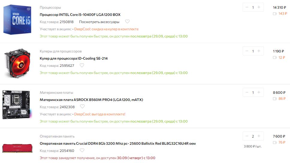 RusD Решил всё таки посмотреть цены в ДНС. Процессор на 700 рублей дешевле. Там два варианта, берите который SRH79, у него припой под крышкой. ASRock B560M Pro4 тоже дешевле. Кулер можно взять ID-Cooling SE-913-R PWM (также есть B-версия). Память чуть дороже - Crucial Ballistix Red [BL2K8G32C16U4R].
