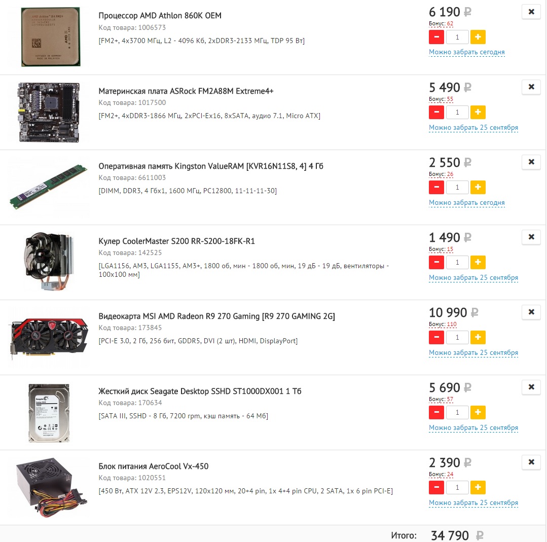 По картинке: заменил матплату на более качественную и с 4-мя дырками под оперативку. Кулер тоже поменял на более дешевую и качественную башню. Жесткий диск поменял на аналогичный объем, но гибридный - работает быстрее, сам проверял =) БП на 450 В от Аэрокула лучше, чем 500 В от Гиги, у первого по 12В - 360, а у Гиги - 276. Вывод очевиден Видеокарту взял от МСИ - она получше будет