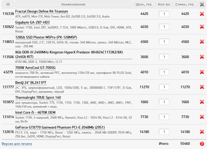 1) Бюджет 40-50 тыс. рублей (лучше 40, но возможно увеличение до 50-55, если будет какое-то качественное увеличение производительности. 2) Брать все буду или в Ситилинке (Москва) или в Регарде (Москва). - возможно еще что-нибудь посоветуете. 3) Собираюсь брать системник и монитор (макс. задержка 7-8мс) 4) Берется для игровой системы (Starcraft 2, Dota 2, BF3, UT3), а также работы в программах Autocad, Photoshop, Indesign. 5) Разгон планируется в случае недостатка производительности, но без какого-либо фанатизма. 6) Апгрейд новой системы не планирую в ближайшее время, если только докуплю оперативной памяти. 8) Предпочтения по системе: - Intel / Nvidia - Стиль корпуса должен быть минималистичен, хочется небольшой корпус формата mATX со стандартным расположением комплектующих, но не уверен, что с данной конфигурацией будет уместен. Возможно использовать небольшой корпус формата ATX - поэтому прикладываю 2 конфигурации - mATX и ATX (корпуса фирмы Lian просьба не предлагать ) - Требования по шуму. Чем тише, тем лучше 9) Наброски конфигурации ПК.