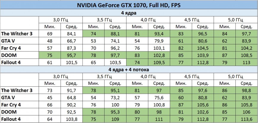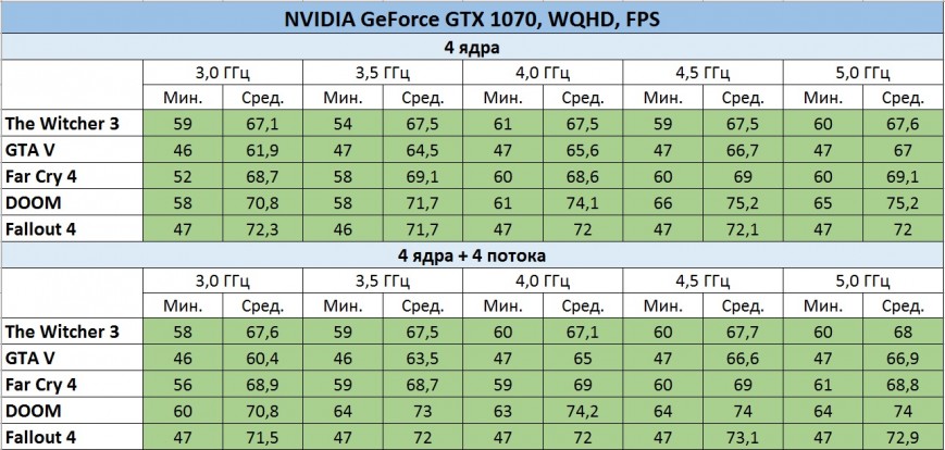 Таблицы процессорозависимости GeForce GTX 1070 в FullHD и WQHD
