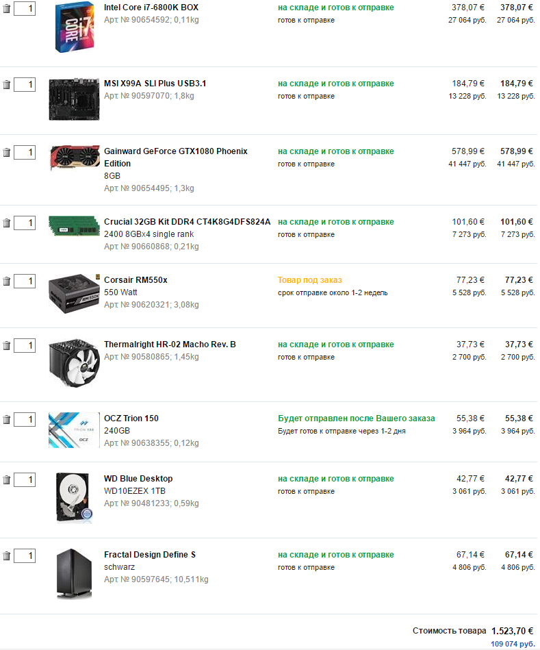 Krokodil72, немного вылез из бюджета, для игр ещё дешевле можно собрать, например взять проц 6700k, мат. плату msi z170a sli plus, если тишина не критична, то заменить корпус на zalman z3 plus и блок питания взять seasonic s12ii-520 он шумней в нагрузке.