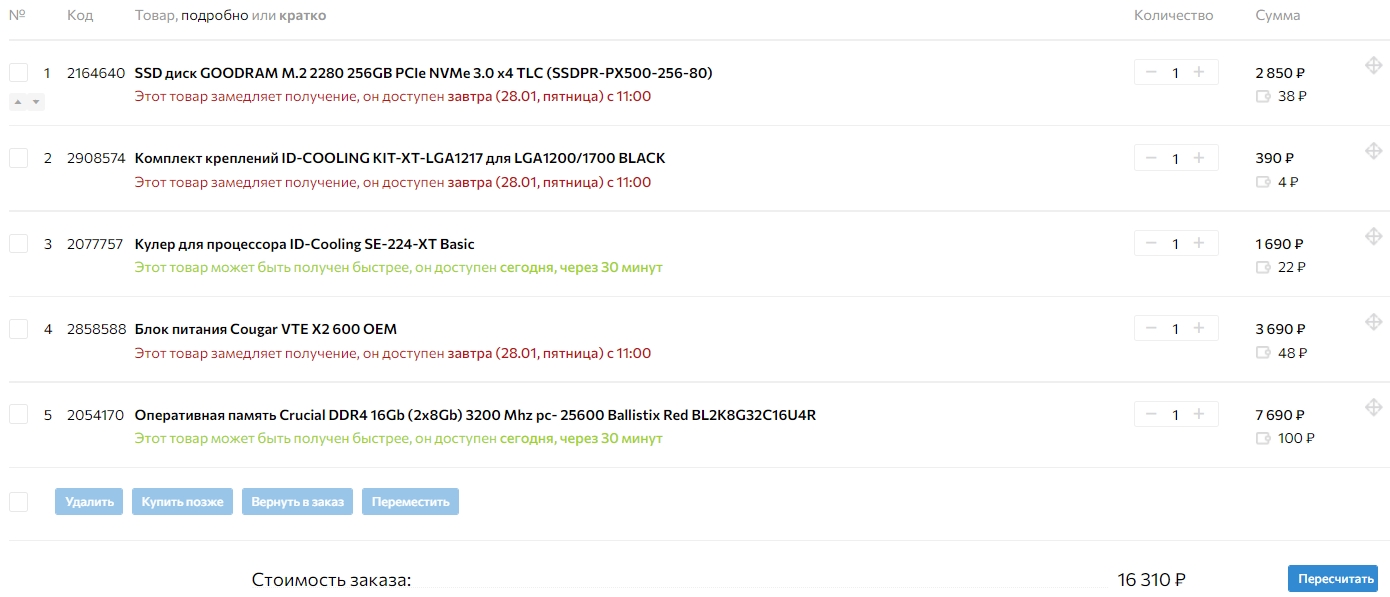 Всем привет, подбираю конфигурацию под современные игры, т.к. текущий комп уже не вывозит, нужно проц+мать+память+кулер. 1. 30-35к 2. Москва/все равно 3. Современные игры в 1080p 4. Проц+мать+память+кулер 5. Возможно небольшой без экстрима 6. В ближайшее время нет 8. Накидал вариант: Core i5 10400F AsRock B460 Pro4 Corsair DDR4 16Gb 2666MHz pc-21300 Vengeance LPX Black Deepcool Gammaxx 400 EX Нормальный вариант или что-то получше можно подобрать?