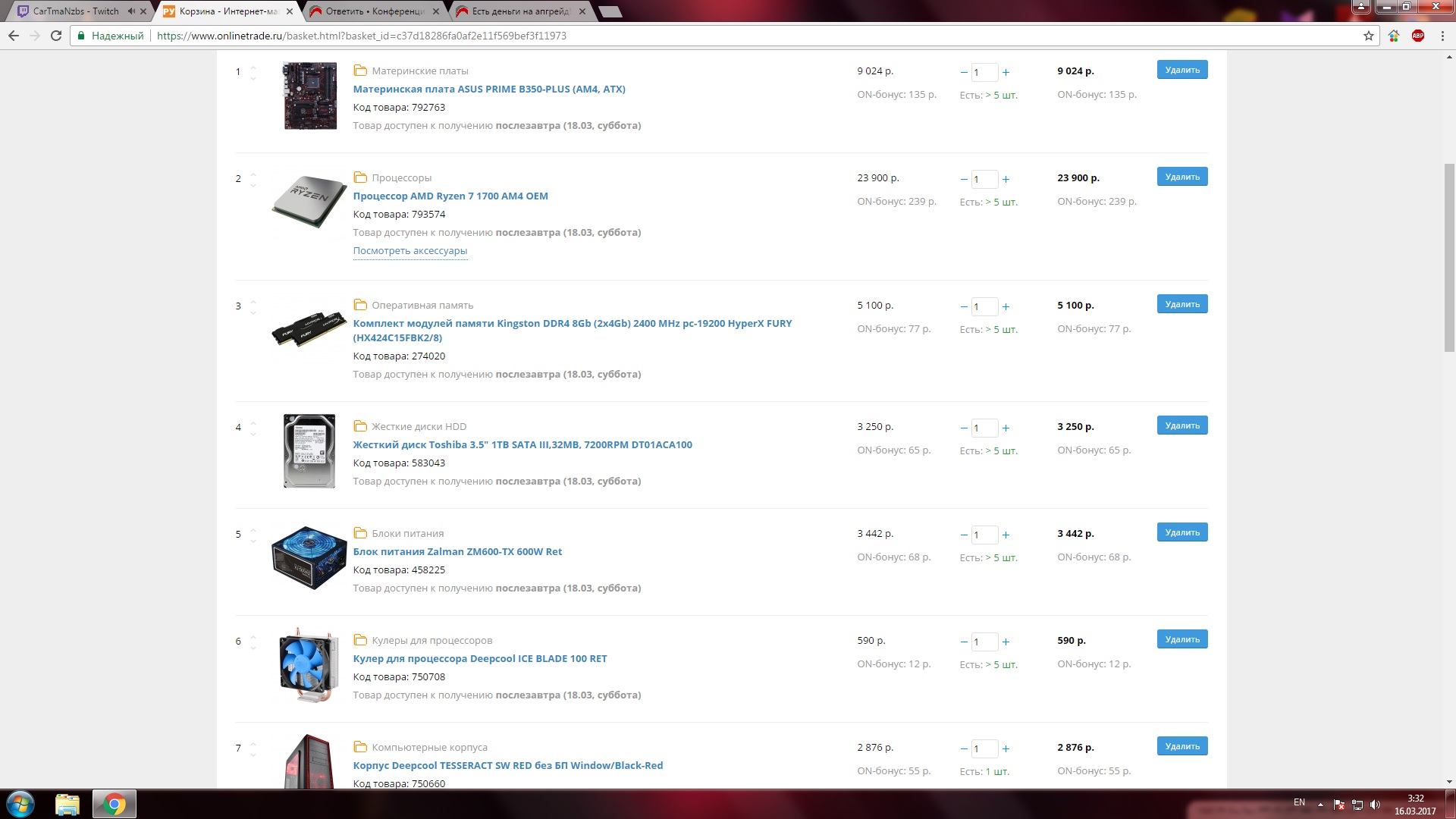 Есть, менять пока не хочу: бп TR2 RX 550W [TRX-550M] корпус Fractal Design Define R5 Black видеокарта STRIX-GTX970-DC2OC-4GD5 (возможно, когда 10ая серия станет подешевле заменю). хд Seagate Constellation ES.3 [ST1000NM0033]