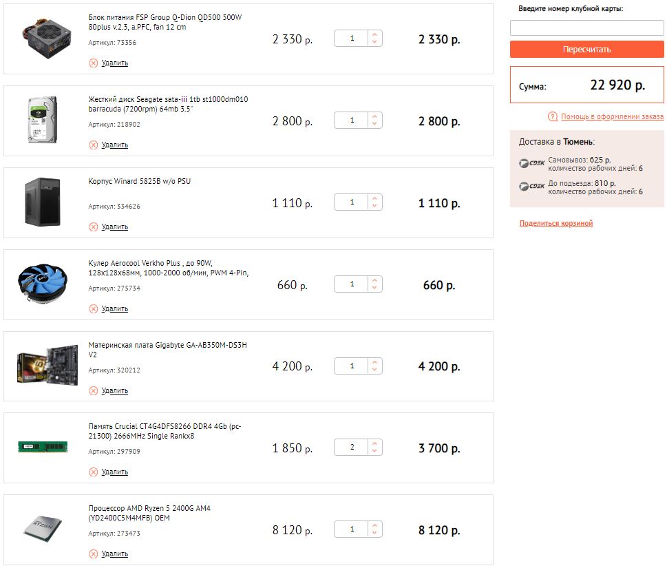 Basket Почти всё самое простое. Материнская плата с 4 слотами под память (чтобы в дальнейшем увеличить до 16 Гб). Блок питания с учетом того, что можно будет в дальнейшем поставить видеокарту средней производительности. Корпус - самая нищая коробка, туда бы вентиляторы на вдув/выдув добавить.
