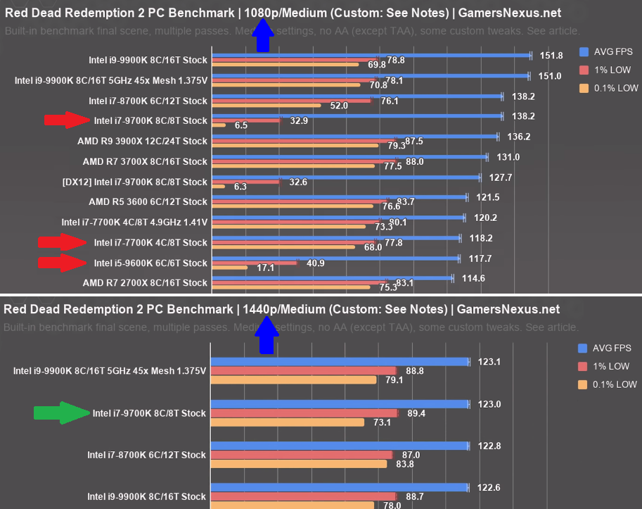 У Intel Core i7-9700k предположительно наблюдаются просадки по показателю 0,1% fps low (все плохо в Far Cry 5 и Red Dead Redemption 2 по тестам Gamers Nexus