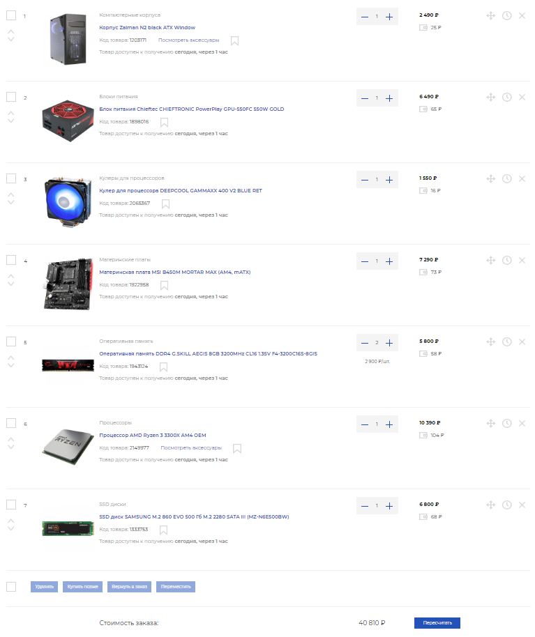 МП я бы взял MSI B450M MORTAR MAX (Cost Effective), но и ASRock B450M Pro4 (преимуществ 0, но она дешевле) вполне подойдет для R5 3600. Есть версия ASRock B450M PRO4-F, она еще дешевле. Ну или GIGABYTE B450M DS3H - это уже дно, ниже нельзя. WD такой у меня, но на 500 Гб. Я очень доволен. Возможно, есть и лучше. Кулер тоже, такой как у меня. Вполне справляется с моим немного разогнанным FX-8350. БП из рекомендованных. Дешевле конечно есть, но я бы не посоветовал тут экономить. По ЦП съэкономить тоже можно, есть такой AMD Ryzen 5 2600X 10290р, который не сильно отстает от R5 3600.