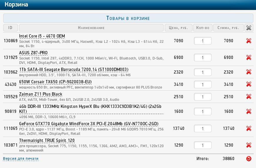 http://www.citilink.ru/ В одном сителинке нет всего что хотелось бы. Поэтому часть из ДНСа. 780378 Видеокарта PCI-E 3.0 GIGABYTE GeForce GTX 770, GV-N770OC-2GD 639735 Жесткий диск 3.5" SEAGATE Barracuda ST1000DM003, 1Тб 780044 Материнская плата ASUS Z87-A 765189 Процессор INTEL Core i5 4670K Стоимость заказа: 30 170 руб. http://www.dns-shop.ru/catalog/cart/?ca ... 1,127683-1 ДНС 123206 Память DIMM DDR3 4096MB PC10666 1333Mhz Hynix orig. Х 2 шт. 160844 БП Corsair VS 650W [CP-9020051-EU] 118714 Кулер IceHammer IH-4500 127683 Корпус Miditower ATX ZALMAN Z9 Plus Итого: 8 790 руб. Общая сумма по двум магазинам: 38 960 руб.