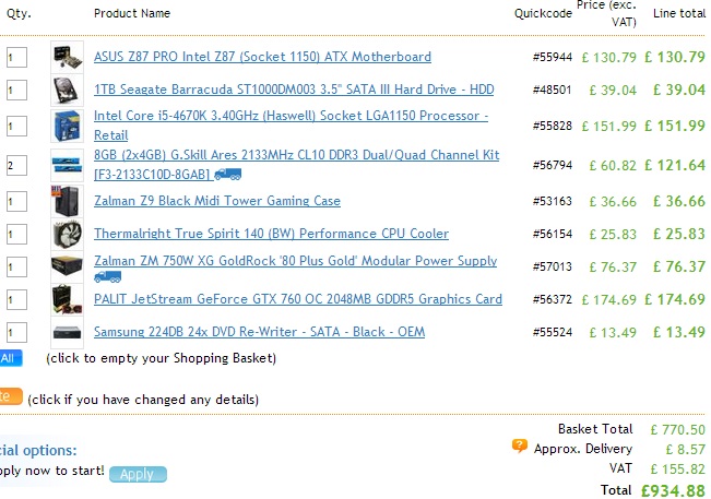 блоке питания - Вы зарядили под 2 таких видеокарты, как выбрали. А под одну хватит и CX600 #52662. Переход с i5 на i7 внутри Haswell не увеличит потребления.