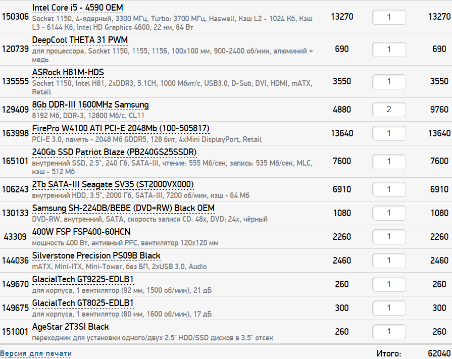 Чуть не забыл, нужно чтобы в магазине обновили биос материнки, или вообще закажите со сборкой магазина. Если будете собирать сами, то поменяйте процессор на i3-4150; если будет OEM, то кулер DeepCool Theta 20 PWM.