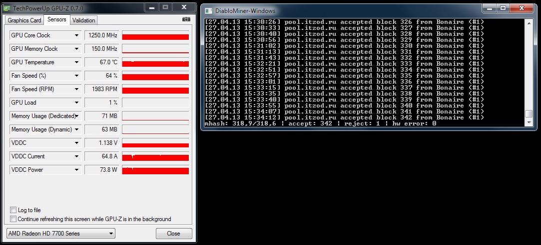 Это в каком майнере? Цифра очень большая, на мой взгляд. У меня в дьябломайнере 199 мх/с было на 7770@1050 МГц., а 7790 выдает сейчас на номинале 282 мх/с: