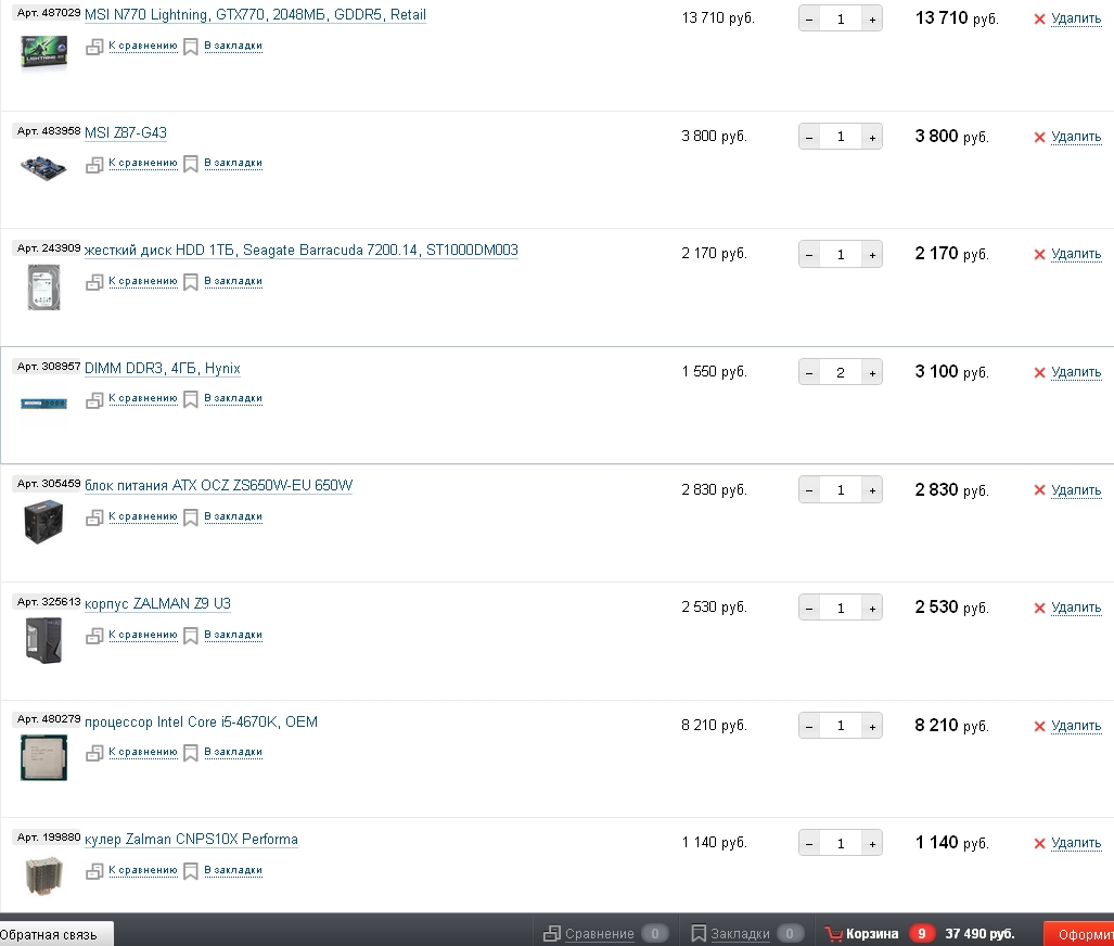 Приветствую всех участников форума! 1) До 40.000 2) г. Москва, магазин - предпочтительно Ситилинк (Citilink.ru), можно на крайняк Ulmart.ru или уже на совсем-совсем крайняк - Dns-shop. 3) Только системник, причем есть корпус - Thermaltake Swing, думаю его и оставить, если будут варианты по корпусу - предлагайте (можно сверх 40к) 4) Для каких задач берётся сабж.: а) Игры: Battlefield-4, WoT, L4D, вообщем самая тяжелая - BF4. Разрешение монитора: 1680х1050. Менять - не планирую. в) Для графических станций: Жена занимается графикой\дизайном\рисование\рендеринг и т.п. Но по сути - всегда хватало мощности игрового ПК, только оперативки тупо больше бралось. 5) Разгон - в первое время точно не собираюсь разгонять, в последствии - скорее всего, но неизвестно когда. SLI \ CrossFire точно не хочу. 6) Ближайший апдейт системы - максимум новый корпус в первый год. (за 3,5-макс 5к) 7) Из старого: Винты на файловую помойку и корпус Thermaltake Swing - планирую использовать. 8) - Брендовая принадлежность: Intel (желательно LGA 1150), nVidia (GTX-серия скорее всего) - Требования по дизайну/размерам - Если корпус будет стильный (аля Cooler Master Silento или Urban-Серия Thermaltake) - то это хорошо на размер - всё равно. - Требования по шуму - чем тише, тем лучше. Но без фанатизма и ущерба производительности. - Иные - Желательно BOX'й кулер, но не критично. 9) Наброски конфигурации ПК: Набросал тут http://www.citilink.ru/configurator/q3783070/ Дублирую и сюда: Материнская плата ASUS Z87-A LGA 1150, ATX, Ret Процессор INTEL Core i5 4670K, LGA 1150, BOX Видеокарта PCI-E 3.0 ZOTAC GeForce GTX 770 AMP! Edition, ZT-70303-10P, 2Гб, GDDR5, OC, Ret Модуль памяти CORSAIR Vengeance CMZ16GX3M2A1866C10R DDR3- 2x 8Гб, 1866, DIMM, Ret Жесткий диск 3.5" SEAGATE Barracuda ST1000DM003, 1Тб, HDD, SATA III Накопитель SSD PLEXTOR M5 Pro PX-128M5P, 128Гб, SATA III Блок питания HIPER V600, 600Вт, 140мм, черный, retail