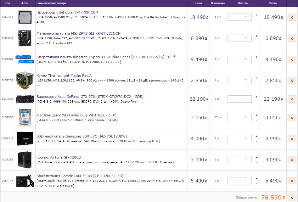 Добрый день! Помогите определиться с выбором. 1. 85 тысяч рублей. 2. http://technopoint.ru/ Оренбург 3. системник и монитор 4. в) Монитор Ips FullHD 24", линейка программ adobe для работы с фото и видео, в основном Premiere Pro. 5. планируется разгон 6. возможно, добавление HDD, второй видеокарты, оперативной памяти. 7. нет 8. комплектующие должны быть в наличии в магазине 9. примерная конфигурация во вложениях