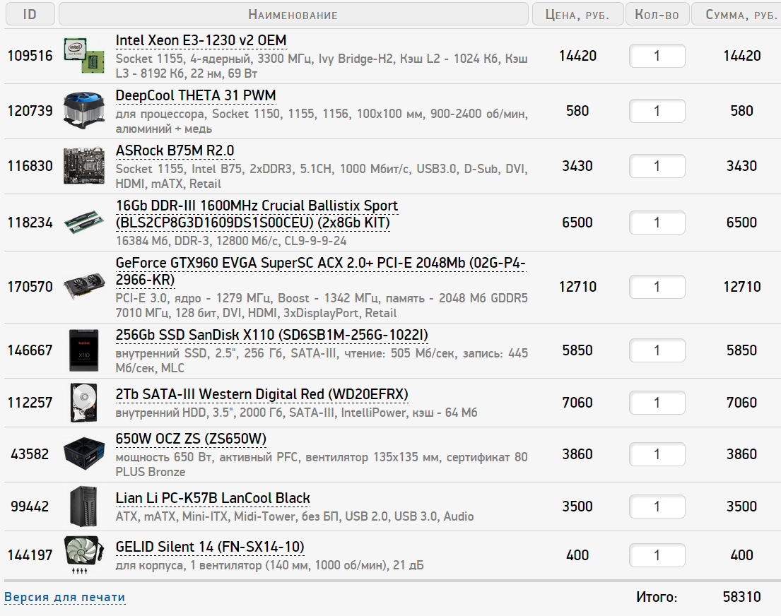 Проц E3-1230 v2 дешевле своего нового аналога E3-1230 v3 на 2 тысячи. Это самый дешёвый 4-ёх ядерный 8-ми поточный Intel, полный аналог i7, только с отключенным интегрированным видеоядром. Сокет предыдущий, но разница в производительности пару процентов. Соответственно и материнка предыдущего сокета. Поставил предыдущего сокета ради экономии, но можно и добавить эти 2 тысячи, если сильно хочется именно последнего. Кулер с медной пяткой, крепёжной пластиной и плавной регулировкой оборотов. Память самая дешёвая от нормального производителя (один из 3-ёх мировых лидеров). Видеокарта тоже самая дешёвая из достойных. Уважаемый производитель и больший заводской разгон среди ценовых аналогов. SSD из рекомендованных. Тоже проверенный временем от именитого производителя с нормальным контроллером и флешем. HDD ~5400-5900 об/мин, поэтому тихий и достаточно быстрый. БП тихий и с японскими ёмкостями. Корпус с 2-мя 140-ками на приток и пылезащитой. При этом вес 9,2 kg! Ну и кулер - тихая 140-ка. По хорошему: кулеры все сразу перевести на 7 Вольт, и будет достаточно тихо. Монитор ошибся, не тот хотел. Смотрите на 2560 x 1440 пикселей 27".
