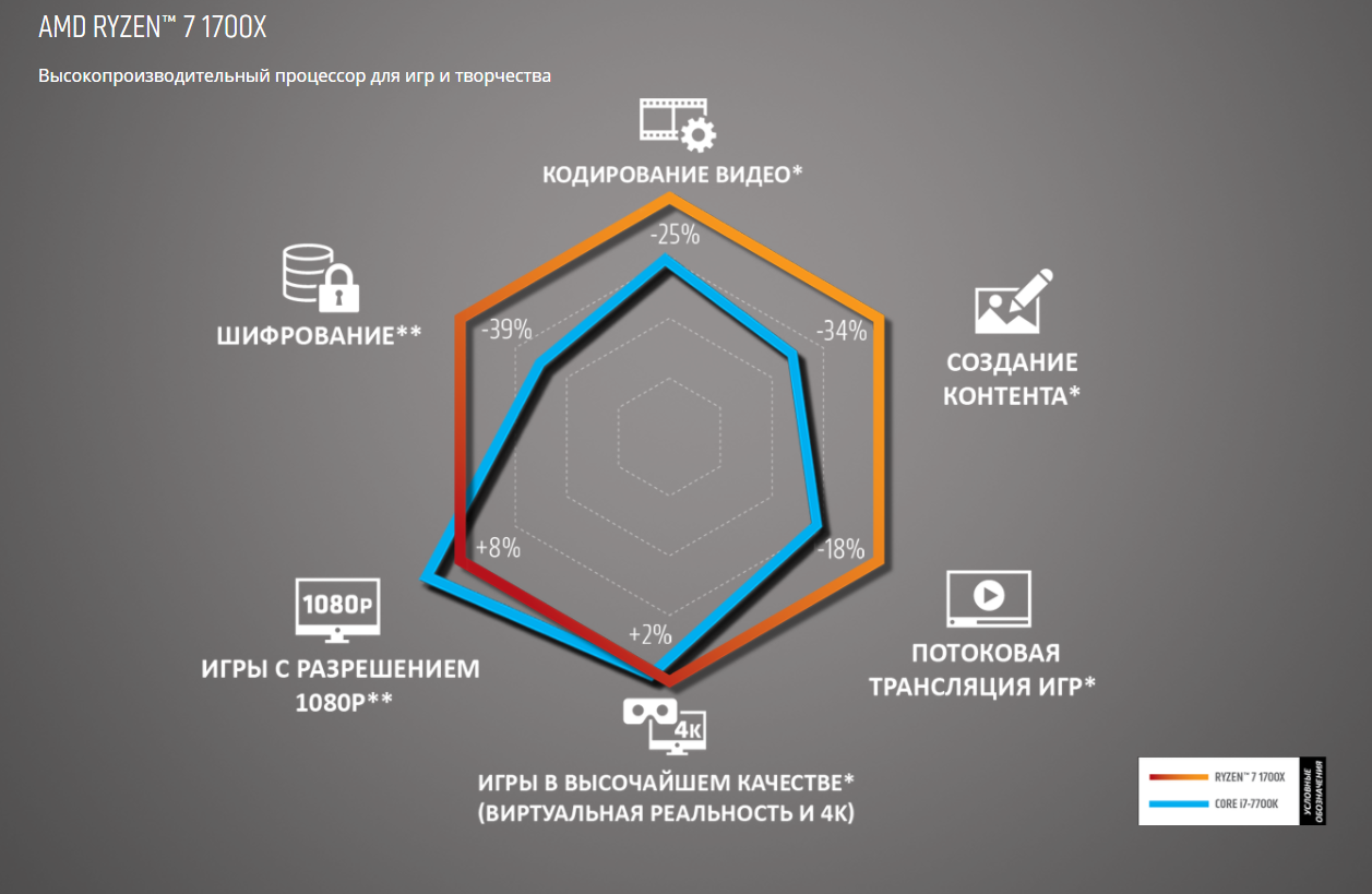 Это интересно! Вот официальный график от AMD. Сама AMD утверждает, что чисто для игр 7700K получше, как в 1080p, так и в 4К. А вот для всего остального - Ryzen 7 1700X: