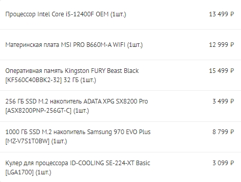 С АЛИ вон мою конфу Ryzen 5500, ASUS TUF GAMING B450M-PRO S( суммарно около 15-17), лень смотреть , KingSpec KS3200D4P13516G 2x16 Gb Micron B-die - память одну планку( 3000) или две(6000),хотя память можно и в ДНС-ах - какой нить NETAC, тут как по деньгам. В Ситилинке за ~3000р SSD NVME на 512гигов. И копим на видяху. Хотя на 1280 на 720 можно с Али и 570ю взять за 5к - хотя зачем?