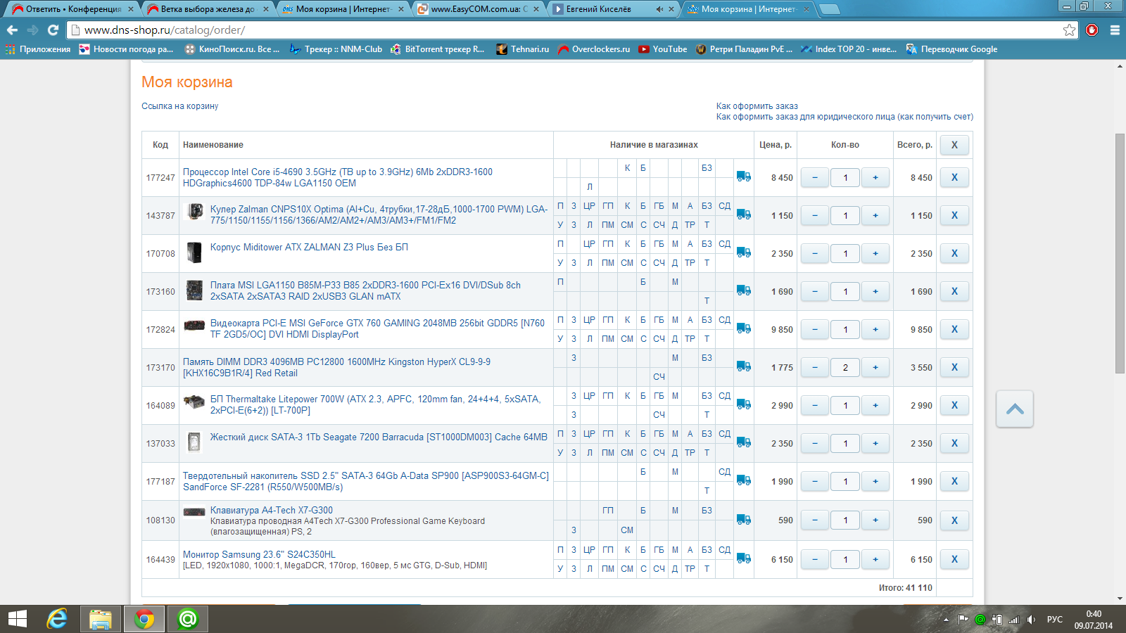 Смени магазин... Технопоинт: 6610671 Процессор Intel Core i5-4670 148576 Кулер DEEPCOOL GAMMAXX 300 6611519 Материнская плата ASRock B85 Pro4 6610399 Твердотельный накопитель SSD SiliconPower S55 SP120GBSS3S55S25 137033 3.5" Жесткий диск Seagate Barracuda ST1000DM003 157580 Оперативная память Hynix orig.[DIMM, DDR3, 8 Гбx1, 1600 МГц, 12800 Мб/с, 11-11-11-28] 6634594 Блок питания Zalman ZM700-GLX 6630272 Корпус ZALMAN Z3 6616765 Видеокарта MSI GeForce GTX 770 [N770 TF 2GD5/OC] 6607385 Монитор BenQ GL2460HM Общая сумма:41 540 руб. RS. ореративки можно и две, а клава-мышь, здесь дело вкуса. Но на будущее, желательно GigaByte GeForce GTX 770 [GV-N770OC-4GD] т.к. современные игры все чаще и чаще становятся очень прожорливыми к видеопамяти. Как промежуточный вариант, и тем более если разгонять, то есть смысл взять MSI AMD Radeon R9 280X Gaming, а если дотянешь до Gigabyte AMD Radeon R9 290 [GV-R929OC-4GD] то вообще будет прекрасно.
