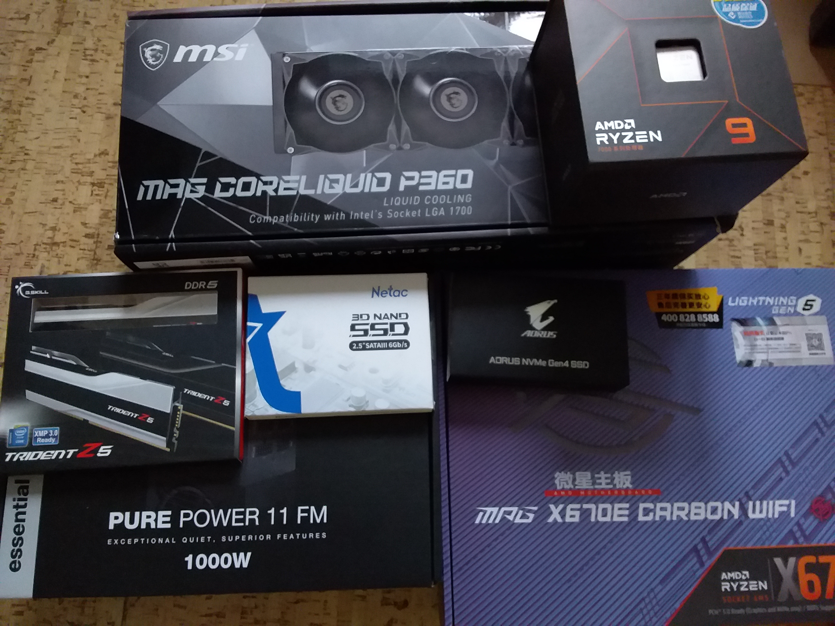 Добрый день, вчера из Китая ко мне пришел процессор. В итоге для новой сборки собрал. 1 Материнка msi x670e carbon wifi 2 Процессор ryzen 9 7950x 3 Оперативка DDR5 6000 MHz 4 Блок питания be quiet! Pure Power 11 FM 1000W 5 СВО msi mag coreliquid P360 6 ssd m2 ssd m2 gigabyte aorus 1tb 7 ssd sata netac N600S 2 Tb После нового года соберу.