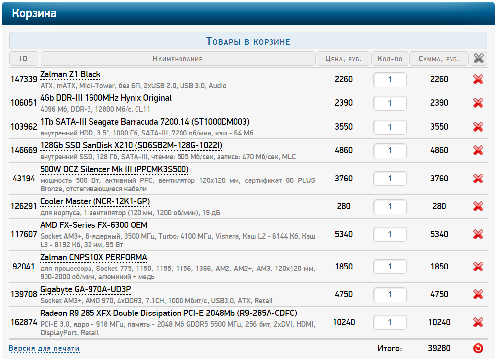 Не в обиду лично вам было сказано, а чисто о сборке. Просто ВК в начальных и средних сборках условно должна быть в 2 раза дороже ЦП, а не наоборот (как в вашей сборке получилось). Zalman Z1 Black = 2 260 Intel Core i3 - 4130 OEM = 7 190 DeepCool THETA 31 PWM = 660 Gigabyte GA-B85M-HD3 = 3 670 4Gb DDR-III 1600MHz Hynix Original = 2 390 GeForce GTX760 ASUS PCI-E 2048Mb (GTX760-DC2OC-2GD5) = 11 870 128Gb SSD SanDisk X210 (SD6SB2M-128G-1022I) = 4 860 1Tb SATA-III Seagate Barracuda 7200.14 (ST1000DM003) = 3 550 500W OCZ Silencer Mk III (PPCMK3S500) = 3 760 Cooler Master (NCR-12K1-GP) = 280 ИТОГО: 40 490