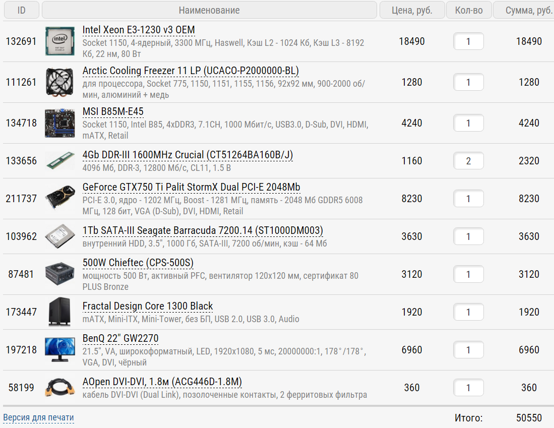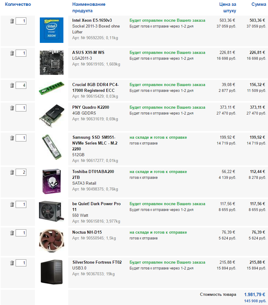 Intel Core i7 - 6700 OEM - 21530 DeepCool GAMMAXX 200T - 1010 ASUS B150M-PLUS - 6180 16Gb DDR4 2133MHz Kingston (KVR21N15D8/16) - 4440 256Gb SSD Transcend 370 (TS256GSSD370S) - 6130 256Gb SSD Plextor M6V (PX-256M6V) - 6420 3Tb SATA-III Western Digital Blue (WD30EZRZ) - 6760 1Tb SATA-III Western Digital Blue (WD10EZRZ) - 3630 Cooler Master V550 (RS550-AMAAG1) - 5640 Fractal Design Core 1500 - 2210 57820 Ну и 22180 на видеокарту, которую надо очень тщательно отобрать для конкретных задач т.к. отличие одной модели за 22k от другой модели 22k в конкретных задачах может оказаться большим.