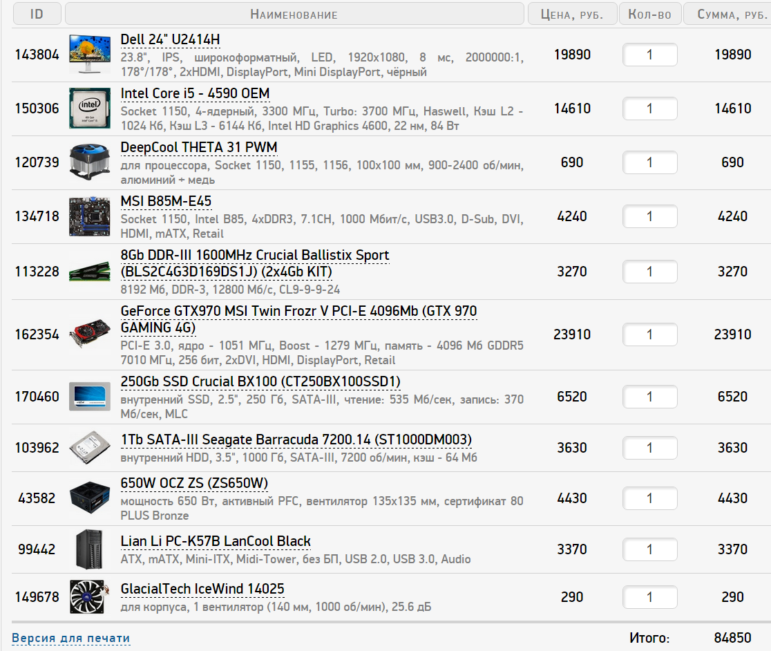 ОК. Спасибо за конфиг. Переделал свой конфиг) Хочется материнку Gaming 3 на Z97))) И у моника Dell же хуже цветопередача, да и дороже он... Вот что получилось:
