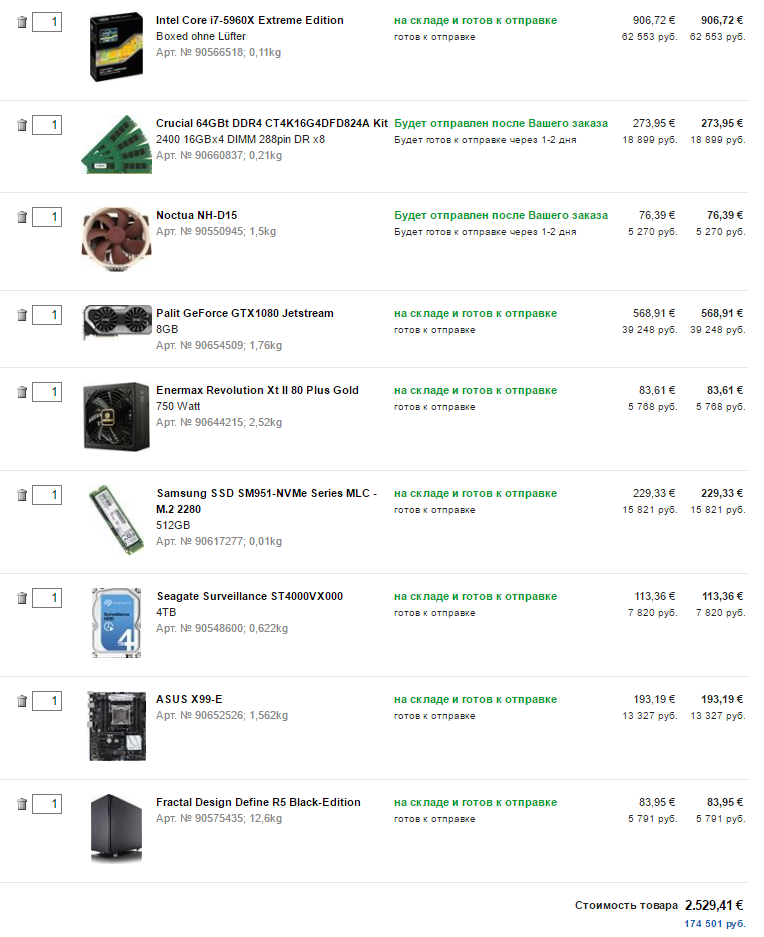 Никита9404, многобукаФ), за 6950x больше переплатите, вообще можно взять 6800K и разогнать хуже не будет). Термопасту Grizzly Kryonaut или GELID GC-Extreme высокая теплопроводность, удобно наносить, хватает на долго. Samsung SM951-NVMe и так высокая пропускная способность зачем рейд, лучше взять один большего объёма, либо Samsung SSD 960 Evo. HDD ST4000VX000 или WD RED PRO. Корпус так себе, можно взять Corsair 400C/760T но дверца прозрачная, если нужна максимальная тишина тогда Fractal Design Define R5 + Noiseblocker BlackSilent Pro Fan PK1, если не то не другое тогда Phanteks Enthoo Pro тоже хороший корпус. Память разогнанная ненужна большего прироста не почувствуете. Переход на Windows 10 целесообразен, 7-ка уходит в небытие) Видеокарта игровая, для ваших задач подходит если не хотите Quadro, производительная/тихая с отличной СО. Как вариант сборки: