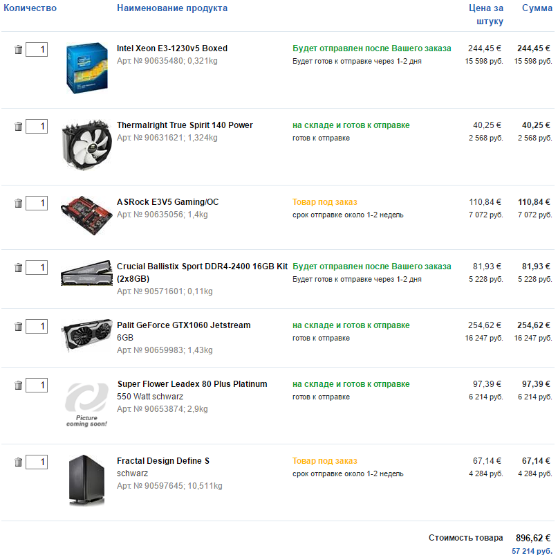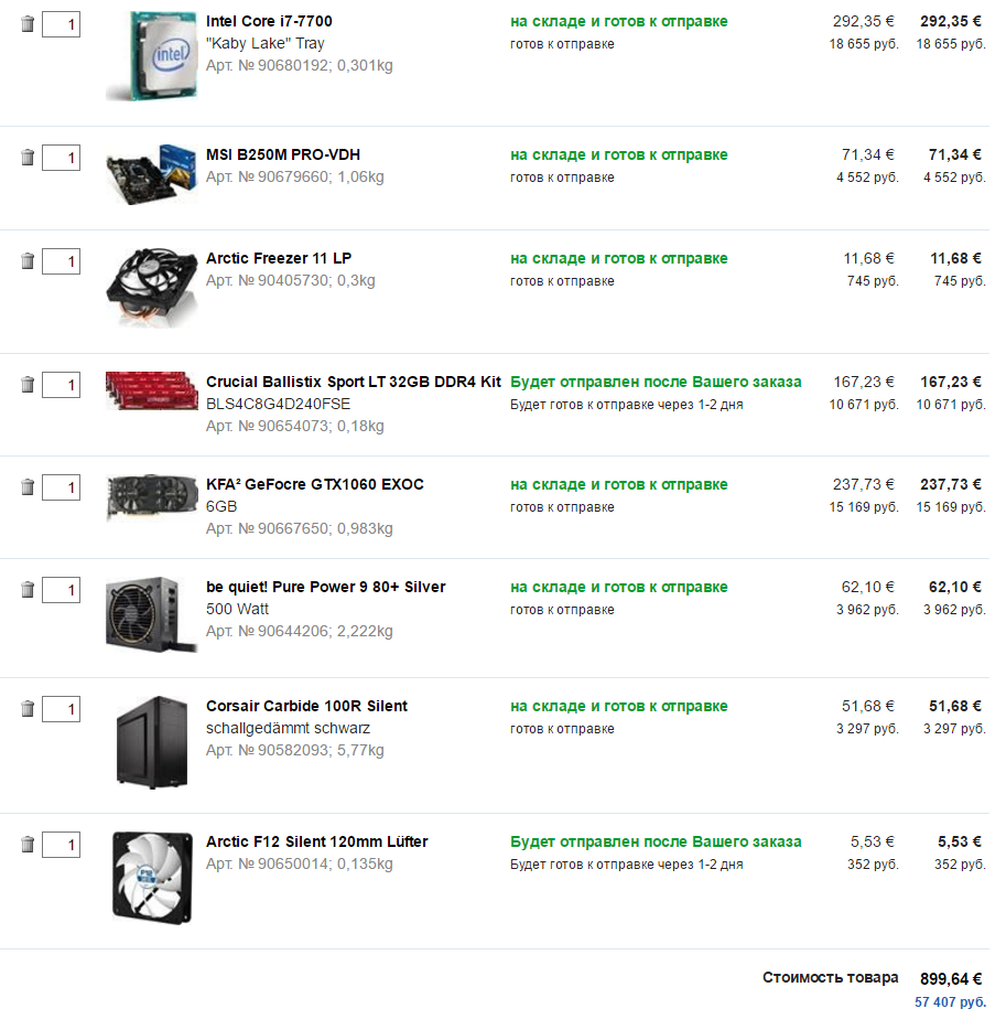 Вариант 1: Блок питания - Corsair RM550x (82,27€) Процессорное охлаждение - Thermalright True Spirit 140 Power (40,25 €) Оперативная память - Corsair Vengeance LPX 16GB DDR4 (2x8GB) 2400MHz C14 (97,39 €) Корпус - Fractal Design Define C (72,69 €) Материнская плата - ASRock Z170 Extreme4 (120,08 €) Процессор - Intel Core i5-7600K (229,33 €) Видеокарта - MSI GeForce GTX1060 ARMOR 6G OC V1 (257,14 €)