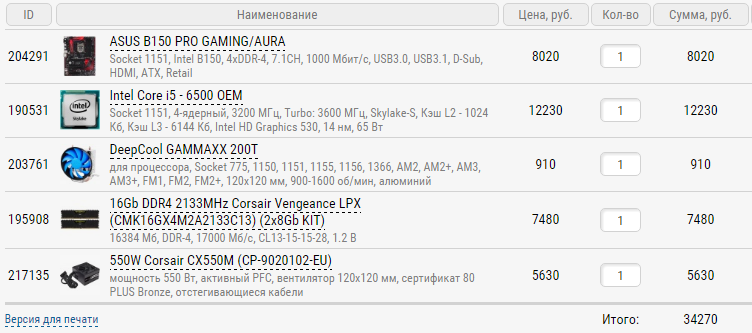 Блок питания - Corsair RM550x (82,27€) Процессорное охлаждение - Thermalright True Spirit 90 M Rev.A (23,45 €) Оперативная память - Corsair Vengeance LPX 16GB DDR4 (2x8GB) 2400MHz C14 (97,39 €) Корпус - Fractal Design Define C (72,69 €) Материнская плата - MSI B150 PC MATE (73,87 €) Процессор - Intel Core i7-7700 (294,03 €) Видеокарта - MSI GeForce GTX1060 ARMOR 6G OC V1 (257,14 €)