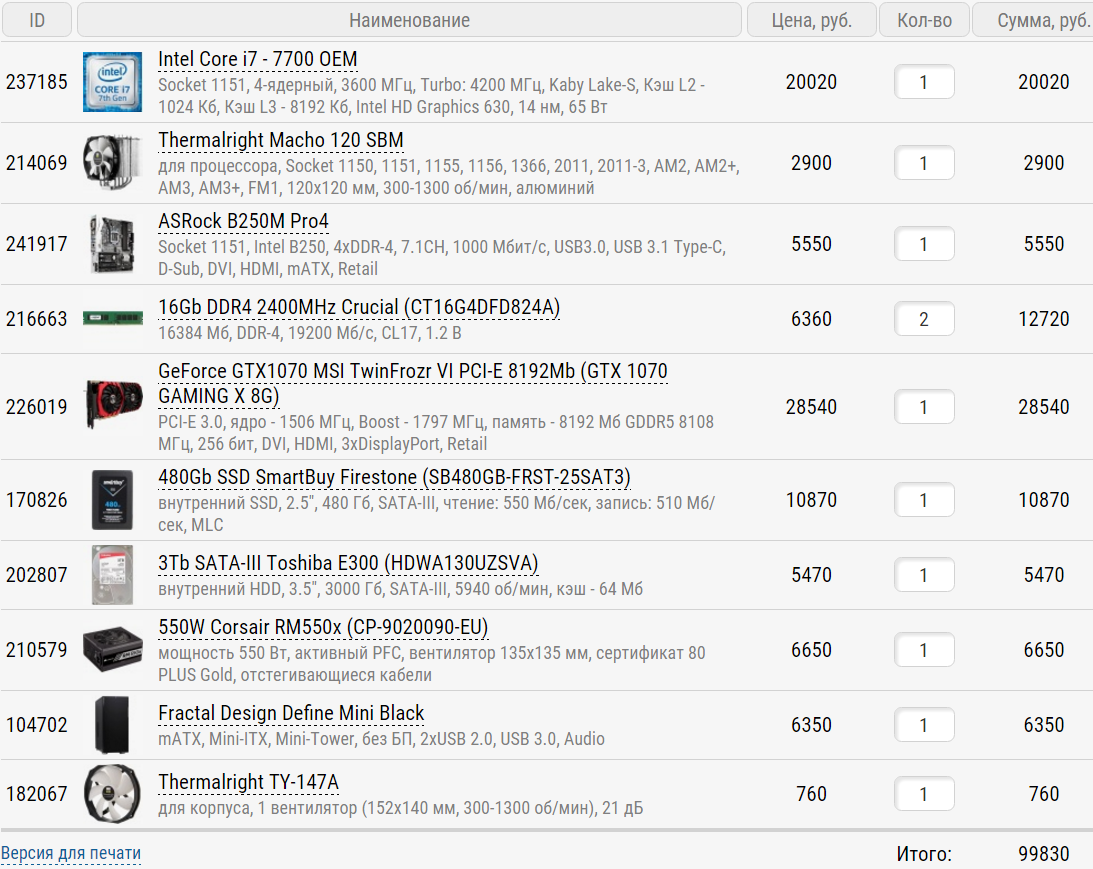 TY-147A точно тихий, на TY-127, который на Thermalright Macho 120 SBM, бывают жалобы на шум подшипника: http://www.hardwareluxx.ru/index.php/ar ... ml?start=4 Но открою вам тайну: почти все Noctua трещат подшипником на скорости больше 900rpm. В этом плане be quiet! Silent Wings 3 самые беспроблемные, на них ни разу не встречал жалоб: ни на форуме, ни в яндекс-маркетах и иже с ними. Но тогда нужно увеличивать бюджет, или что-то резать. Например, не понятно нужен ли вам 480 ГБ SSD, или достаточно и 240-275 ГБ? Нужно ли вам 32 ГБ ОЗУ со старта, чтобы потом можно было до 64 нарастить, или достаточно 16 ГБ на старте, а потом до 32 нарастить? Нужен ли вам объём в 3 ТБ HDD, или достаточно и 1-го ТБ? И что за задачи выполняются ночью - рендеринг?
