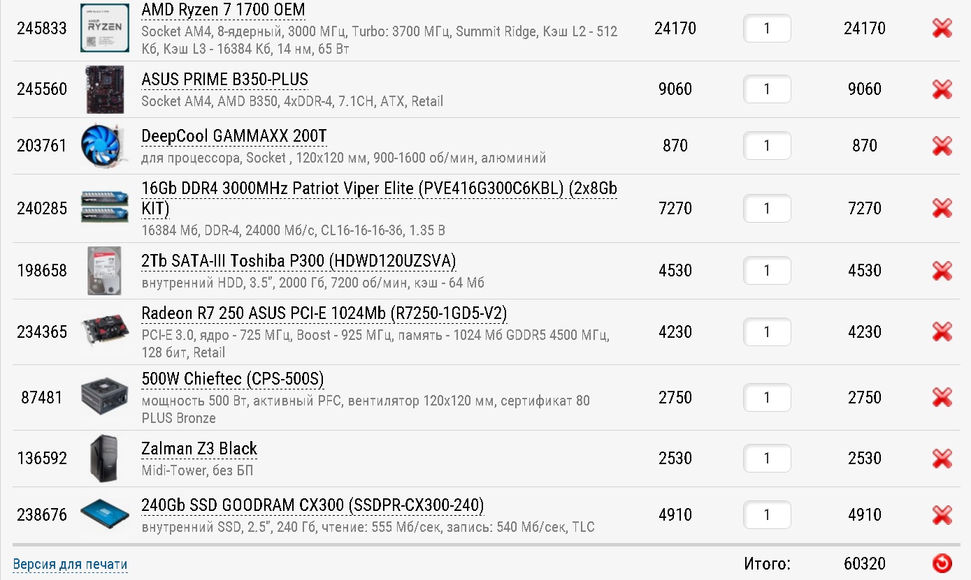 В итоге чтобы вписать в бюджет, придется брать Intel 4-ядерник, память DDR4-2400 которая по дефолту поддерживается у 7-го поколения 16Гб... с GPU непонятно, но можно пока на встройке пересидеть и потом купить, что-то типа GTX 1060 3Gb... А ваш конфиг, больше в тему, для того же Vegas Pro... и памяти мало жрет, и видеокарта AMD в тему (так как интеграшки нет)...