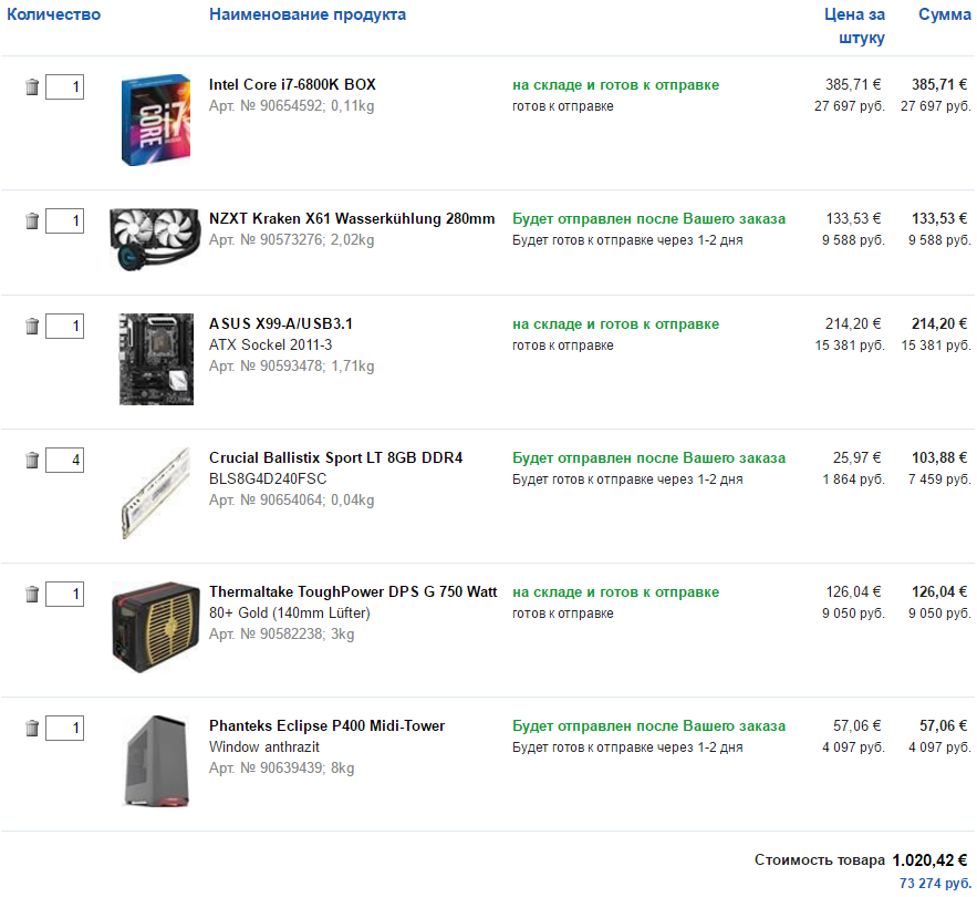 Да там вроде не особо и разница, на память и материнку. В материнке нравится, что это новая модель, сделанная уже под broadwell-e, как я понял, да и наличие 802.11 ac и блютуса не лишнее. Хотелось бы ещё узнать, почему заменили блок питания? Вроде по тестам на сайте seasonic один из топовых. И по охлаждению не плохо бы более развернуто. Спасибо.
