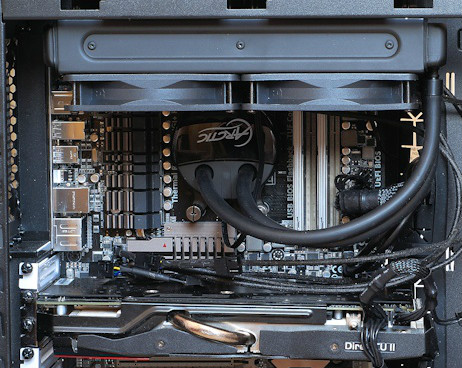 В корпусе Fractal Design Define S водянка ARCTIC Liquid Freezer 240 может частично перекрыть все слоты оперативной памяти, поэтому от использования высоких модулей памяти придётся отказаться. Тогда лучше взять другую СВО например Corsair Hydro Series H110i 120mm.