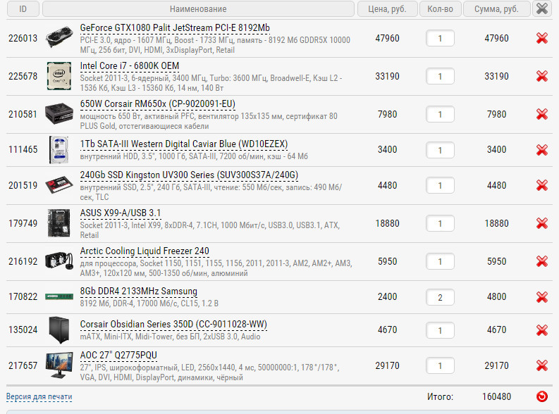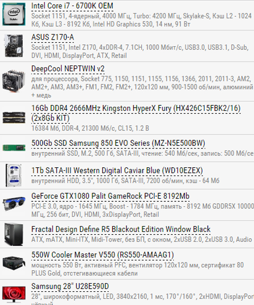ricepudding Я так понимаю, просили за 150К системник и монитор вместе - п. 3. Причем монитор 4К - п. 4. Думаю, если опуститься на платформу 1151 (а на 4К ее достаточно для раскрытия GTX1080), то выкроить из этого на что-нибудь типа http://www.regard.ru/catalog/tovar189534.htm можно.