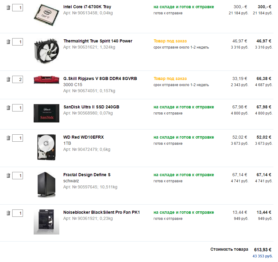 Для игр привлекательней смотрится i7-6700K за счёт своей большей частоты и разгона, память лучше брать две планки для двухканального режима, можно сразу 16ГБ а вообще вторую память всегда можно докупить потом если вдруг не хватит благо стоит копейки, с водой я бы не связывался имхо в простое шумит помпа + вентили, стрелу (Thermalright Silver Arrow IB-E) без скальпирования проца брать нет особого смысла, разница будет с IH-4700/Scythe Kotetsu/Thermalright True Spirit 140 минимальна и габариты у него приличные. Можно собрать такой вариант производительной и тихой системы на computeruniverse.ru, с доставкой и оплатой через PayPal обойдётся - 97756 руб, при условии если разбить заказ на две части (например: видеокарта + бп + мать - первым заказом, остальное вторым) главное чтобы не превышал 1000€.