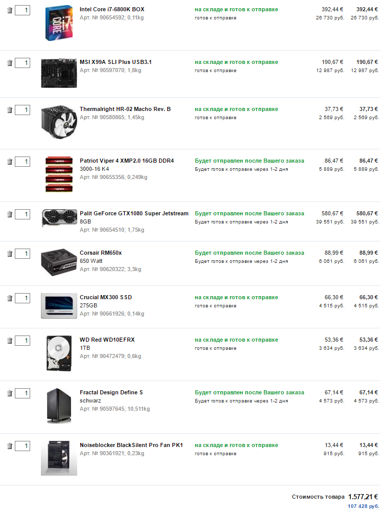 1) 140-150 т.р. (вместе с монитором) 2) https://www.computeruniverse.ru/, сам из СПБ 3) Системник + монитор 4) Беру для игр в 2k 144герц 5) Разгон планирую, но не зверский 6) Хочу чтоб хватило на 5 лет точно 7) С старого компа сниму только SSD Intel 535 8) Процессор intel, карта nvidia 1080. Поменьше шуму и крепкий корпус. 9) Это вот то, что получается к данному моменту. Думаю менять ли мать на Asus, а карту Palit на другую? #77