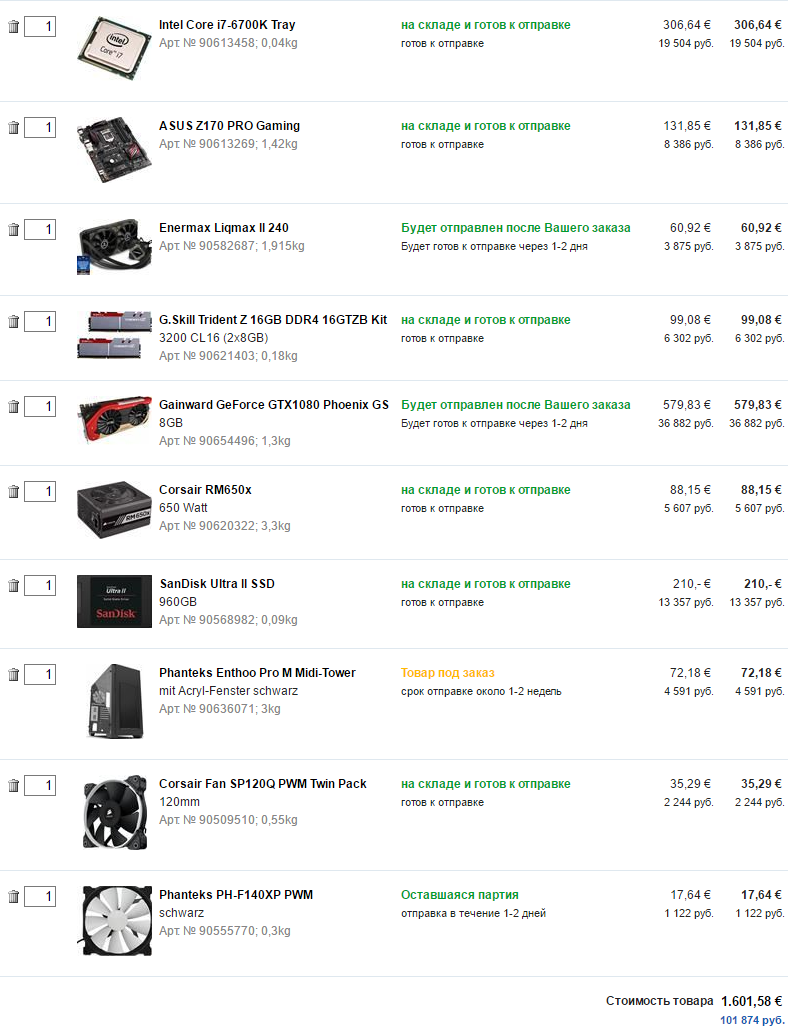 Например на проц, кулер ЦП, корпус, кулера в корпус - гарантия не нужна. Для Toshiba/OCZ и WD есть представительства в России - сдать по гарантии вообще не проблема. Остаются только МП, ВК и БП - вот их и можно брать по месту. Ну а оперативка тоже особо не "ломается" - можно оттуда, а можно и по месту. Конфиг у вас отличный. По мелочам: Корпус сменить бы на NZXT S340 или Fractal Design Define R5. Видеокарту на MSI Gaming или Palit JS/SJS/GR они же Gainward Phoenix. Оперативку можно обычную Samsung/Hynix/Crucial CT. SSD вы не почувствуете, вообще нигде: http://techreport.com/review/30813/sams ... reviewed/5 . Так что берите обычный SATA. HDD можно 5400-5940 об/мин.