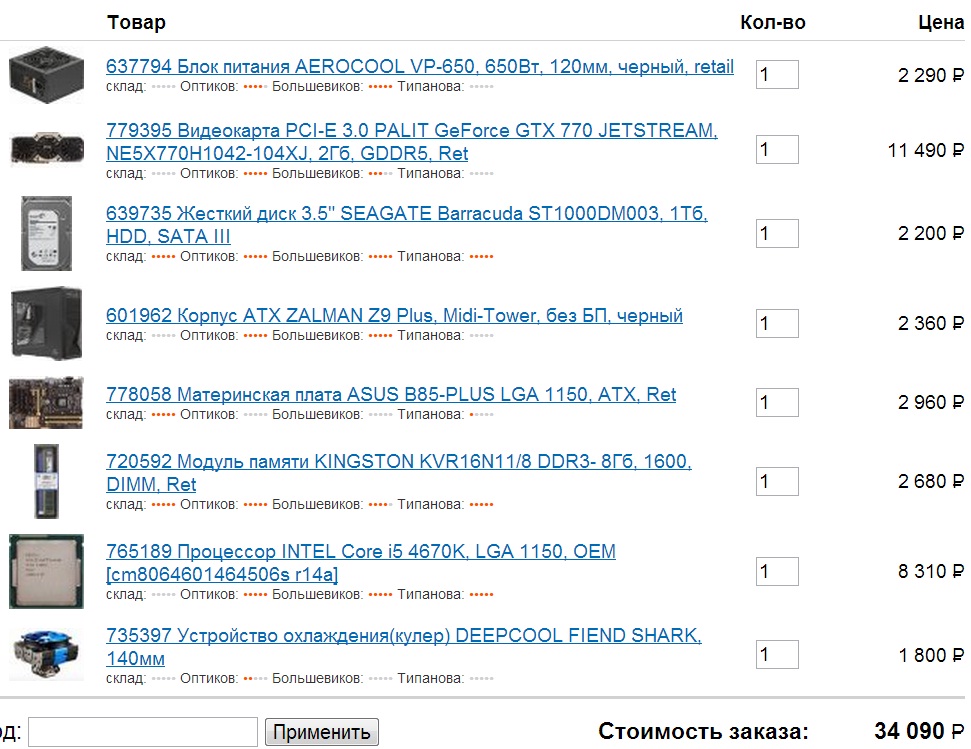 1) 30000; +-3000 2) Санкт-Петербург http://www.ulmart.ru/http://www.citilink.ru/ 3) Только системник 4) Для игр (FPS, RPG, Fighting, Sport) 1600x900 (возможно больше) 5) Разгон не планирую 6) Апгрейд не планирую 7) Железа нет 8) Intel, Nvidia. Шум не принципиален. Желателен хорошо охлаждаемый корпус (воздухом) с окном. По размерам - для мат. плат mATX и ATX. По возможности минимум 4 слота под ОЗУ. 9) Процессор i5 - склоняюсь к 4670. Видеокарта GTX 7xx.