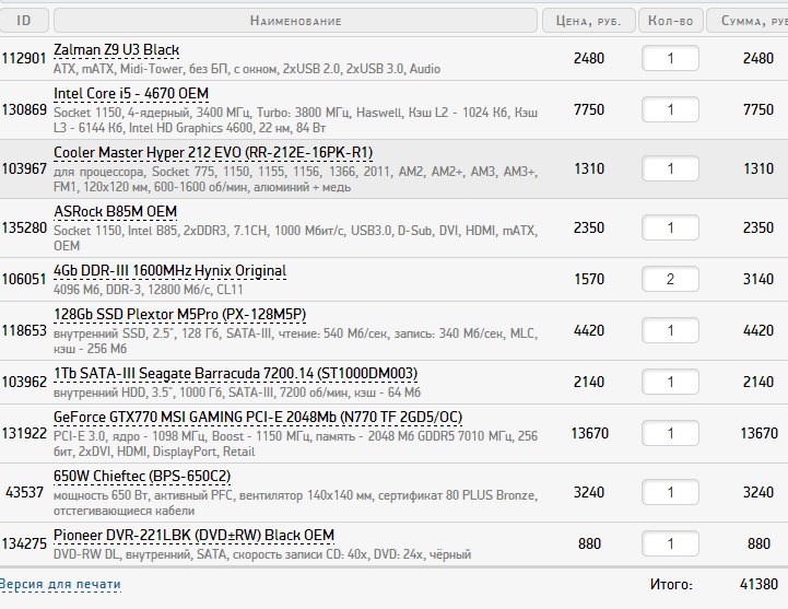 7) Если у Вас есть какое-то железо, которое Вы ещё планируете использовать, уточняйте какое именно. нет 8) Если у Вас есть какое либо требования, уточняйте: - Брендовая принадлежность intel, nVidia - Требования по дизайну/размерам. все равно - Требования по шуму. Уточняйте здесь. Хочу, что бы не был как турбина самолета. Нужно что б не грелся. Я намучался со своим компом. Не хочу больше парится на счет стрекотания куллеров, тарахтению, шуму(чрезмерного). Не гонюсь за супер тихой сборкой. Мощный стабильный комп, что бы выдавал хороший фпс. Хочу вкусить картинку новых игр, т.к. щас стоит комп, где WOW на минималках (дабы не лагало) идет. Жду помощи. Прикинул сам, вышло на 40к, я боюсь выбрал что то шумное)) куллер взял такой что бы с запасом(лучше 500р переплатить, но работал не на рпеделе), остужал проц и его не было слышно.. - Иные. 9) Наброски конфигурации ПК