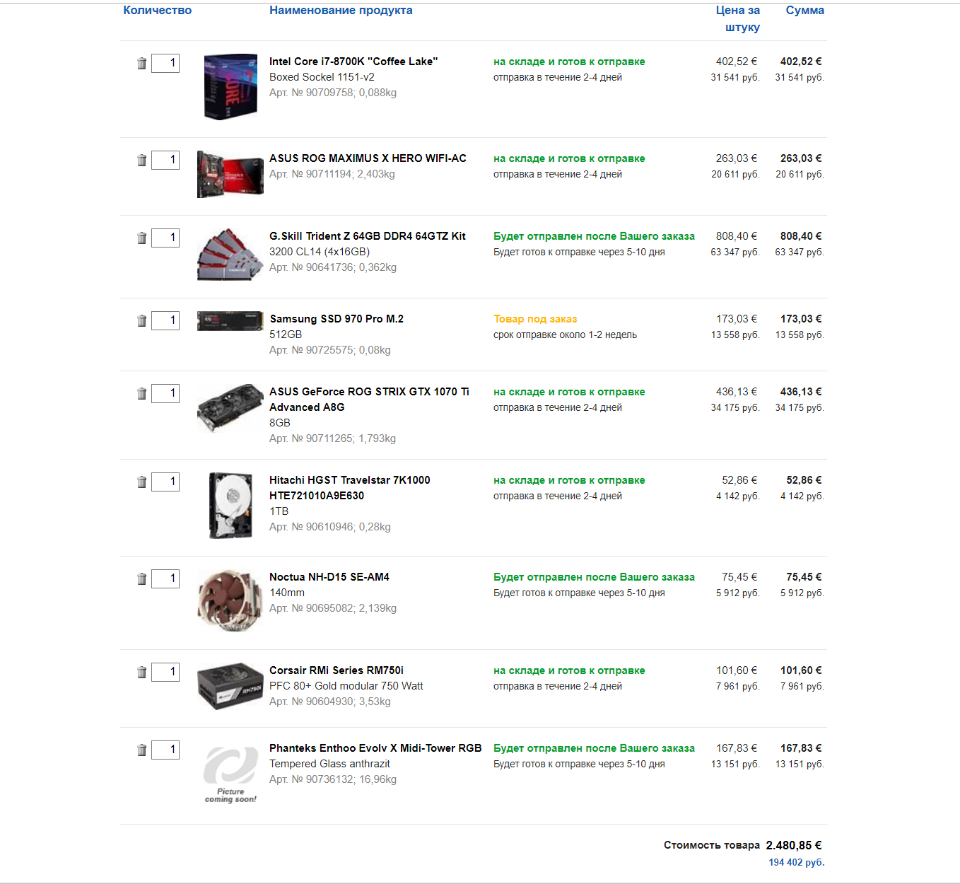 Не совсем так, скорее дороговат и как следствие неоправданн, но в таком бюджете можно спокойно брать, точнее вообще имеет смысл совместить - взять пятисотку-терабайтник 860й обычный и 512ку NVMe(но за Pro я бы доплачивать точно не стал, хватит и Evo),современные игрушки весят столько что диву даешься + софт, с HDD та же история - зависит от того что там будет, можно один шустрый некрупный и один файлопомойник если надо. Ну и свои добавки: проц - https://www.computeruniverse.ru/product ... dition.asp он даже дешевле 8700K, по матери - оверпрайс если нет цели люто гнать за глаза и уши https://www.computeruniverse.ru/product ... gaming.asp из любви к бренду. По видяхе сложнее - с одной стороны Adobe больше любит CUDA с другой далеко не факт что везде будет применим да и разница в реале не вау, с учетом наличия в монитору FreeSync можно посмотреть на https://www.computeruniverse.ru/product ... gaming.asp но тут есть подводные камни: малый диапазон FS, крайне желателен напилинг с бубном, с 1070 Ti в этом плане проще, так что скорее интересно в случае планируемой замены монитора на модель с большим разрешением(варианты 21:9 3440х1440 но там индивидуально - это скорее мониторы для мультимедиа а не работы/серфинга, но выбор в принципе есть - как IPS так и VA, прямые или гнутые, 60-100Гц, а вот среди 4к мониторов с выбором хуже). P.S. С учетом того что многие позиции несущественно дороже имеет смысл часть заказа брать в МСК - с учетом суммы у вам там нужно будет дробить заказ на несколько а это + доставка, да еще конвертация, в общем надо смотреть отдельно по каждой позиции(сейчас еще и цены пляшут так что сравнивать тяжело)