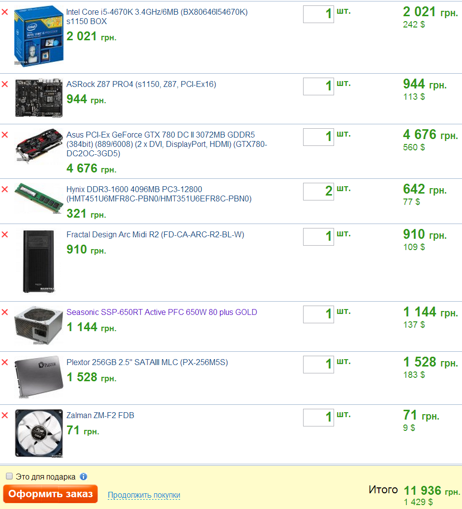 Процессор Intel Core i7-4770K 3.5GHz (TB up to 3.9GHz) Плата ASUS LGA1150 Maximus VI Formula Z87 Видеокарта PCI-E Asus GeForce GTX 770 2048MB 256bit GDDR5 [GTX770-DC2OC-2GD5] - (так же куплена около двух недель назад, если смысл докупить вторую и зацепить их в SLI?) Память DIMM DDR3 8192MBx2 PC12800 1600MHz Kingston HyperX CL10-10-10 [KHX1600C10D3B1K2/16G] HDD SATA-3 1Tb Seagate 7200 SV35 [ST1000VX000] Cache 64MB - (для моих потребностей 1ТБ мне хватает выше крыши) SSD 2.5" SATA-3 128Gb Plextor M5 Pro - (куплен 4 мес. назад он меня вполне устраивает) Кулер Noctua NH-D14 БП Chieftec 850W [BPS-850C/C2] Корпус Fulltower Thermaltake Urban S71